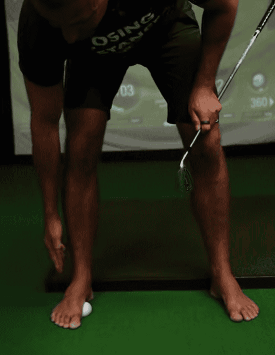 Get into your address position. Pull your belly button in. Now try to squeeze that stress ball—squish it harder—without letting your knee buckle inward.